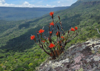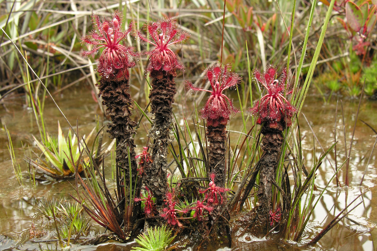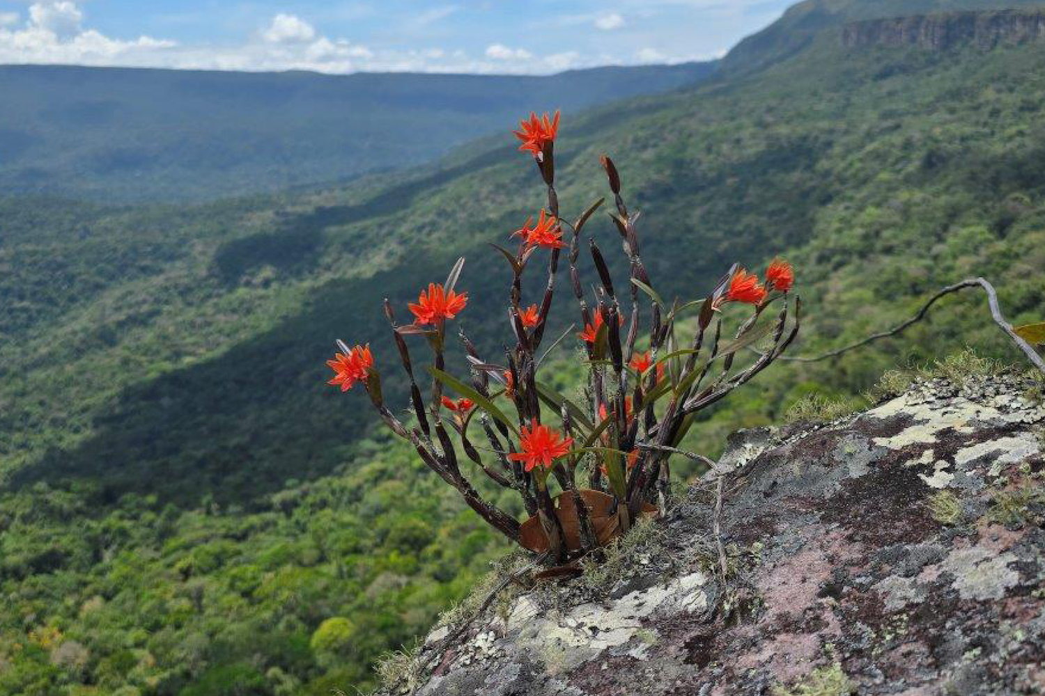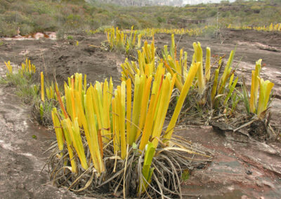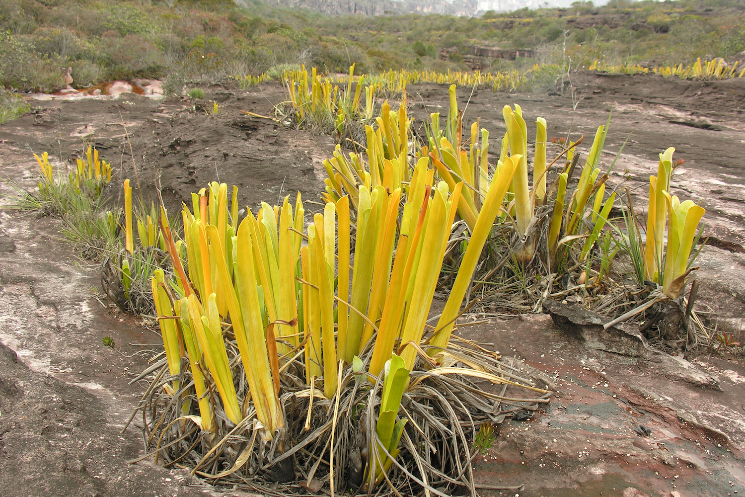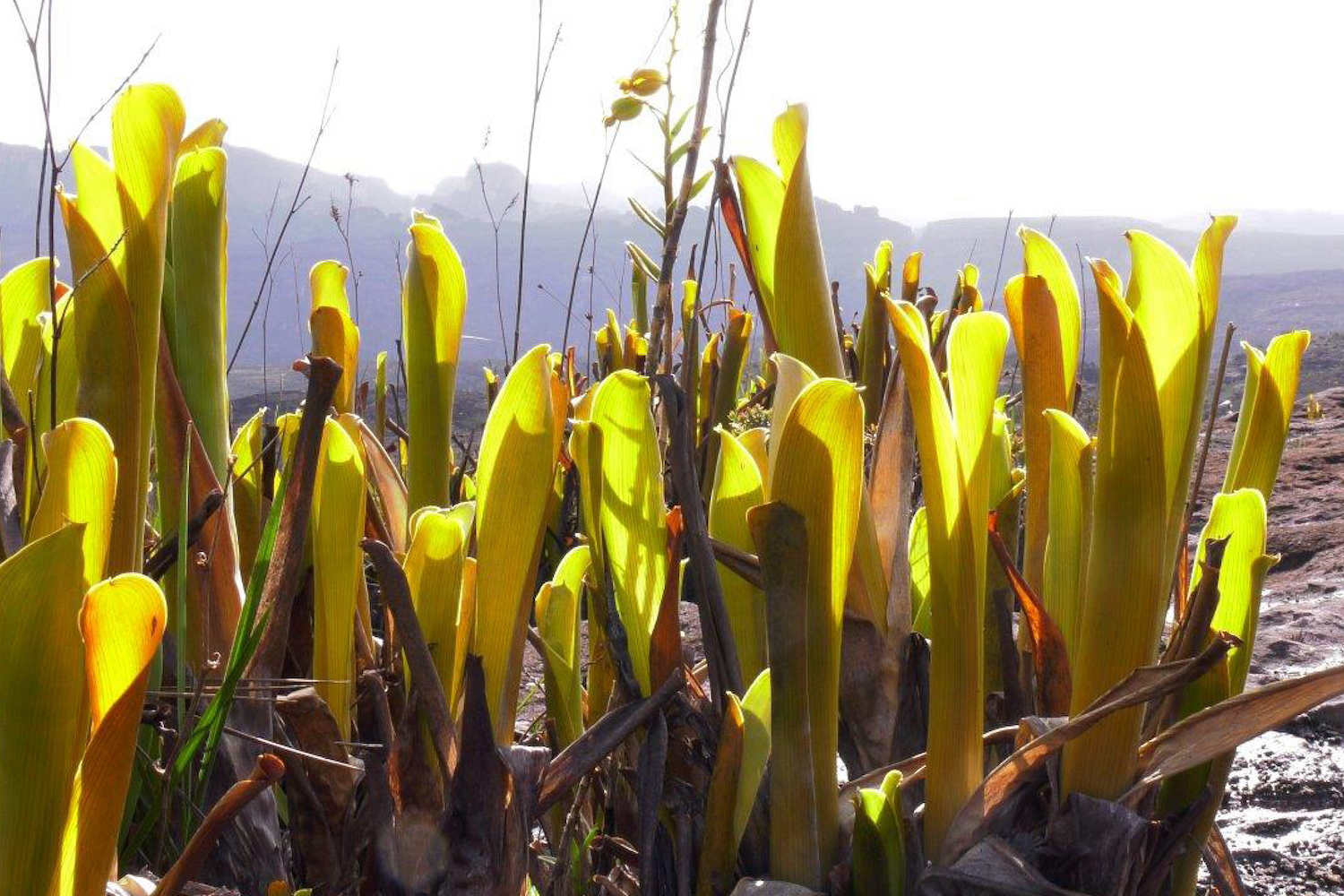 We descend from the plateau summit and trek through misty, lush cloudforest, to a gigantic crack in the cliffsides which forms our staircase down from the summit. We climb through layers of mossy vegetation, through Bonnetia forest and groves of giant bromeliads and treeferns. The views across the surrounding lowlands are spectacular. Below the ledge, we see flowering Utricularia and Genlisea (including usually U. humboldtii). The climb down the ledge takes 4–5 hours. No technical skills needed – but it is steep. A good level of fitness and high stamina is needed. Campside dinner and overnight in tents.